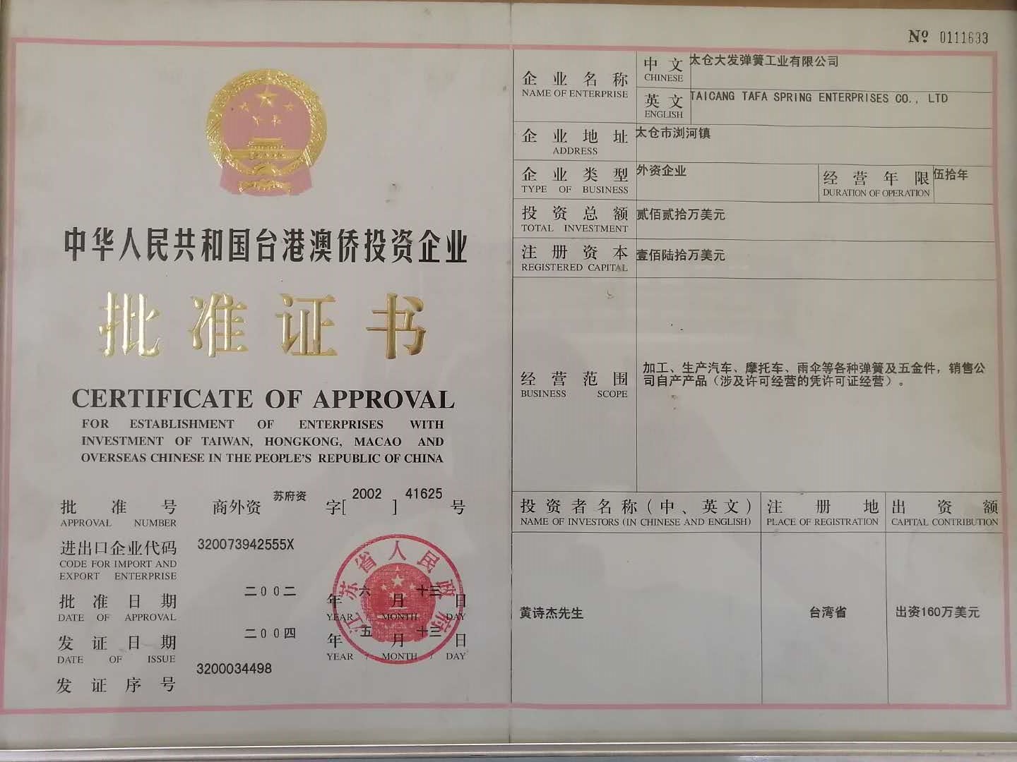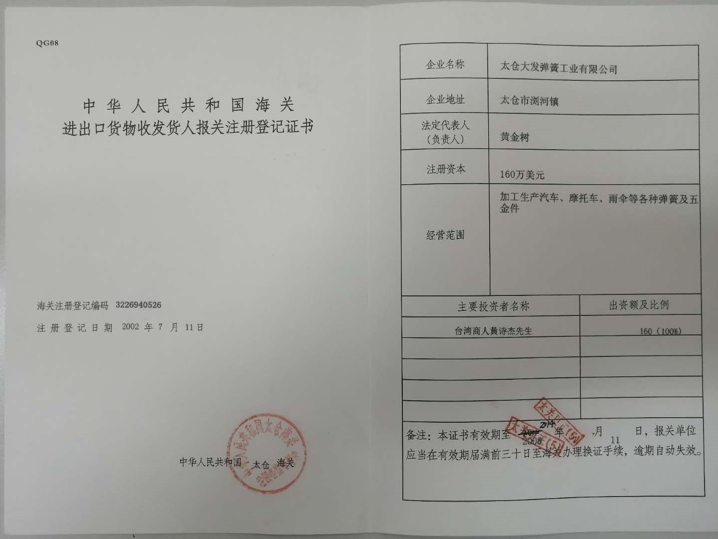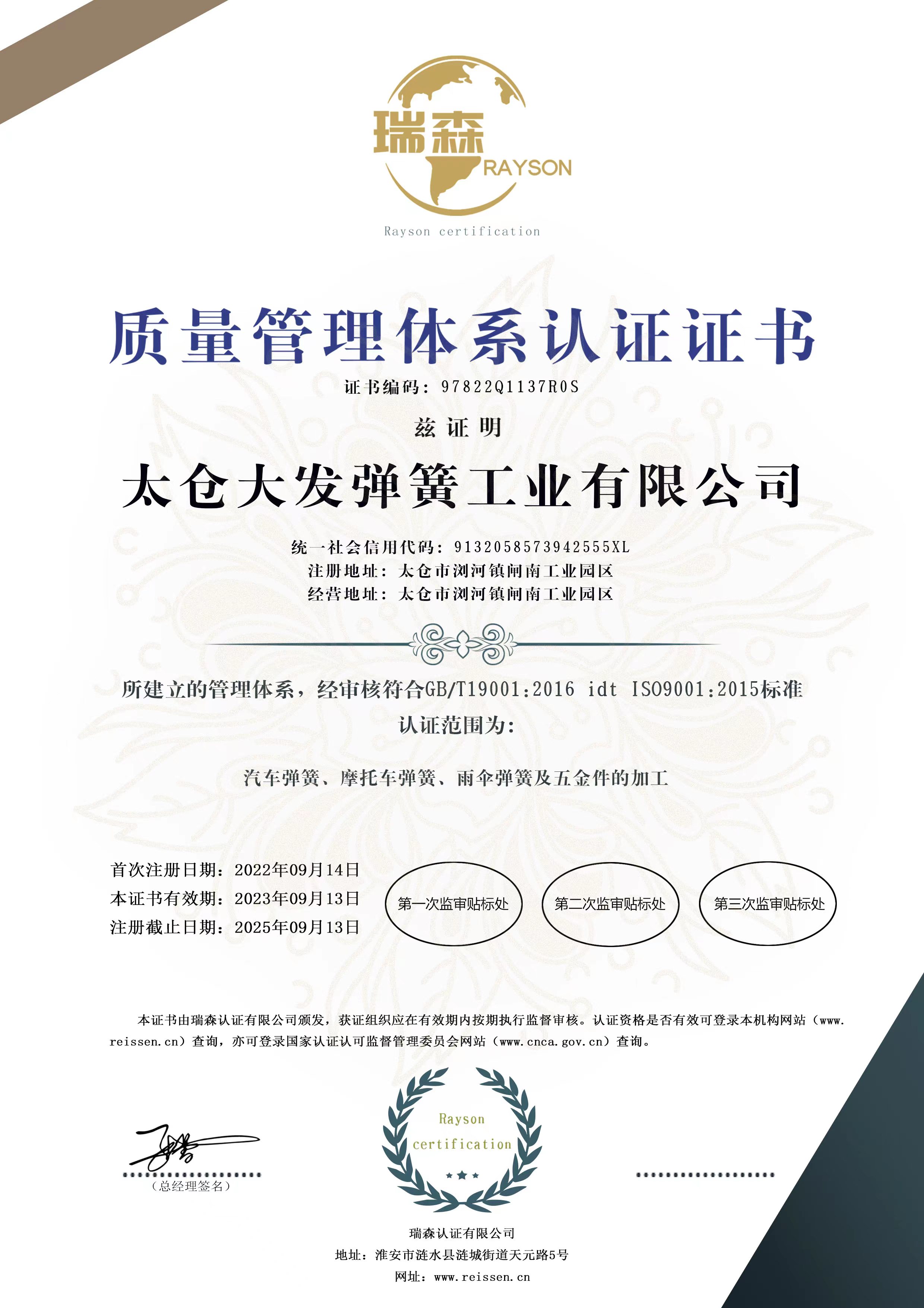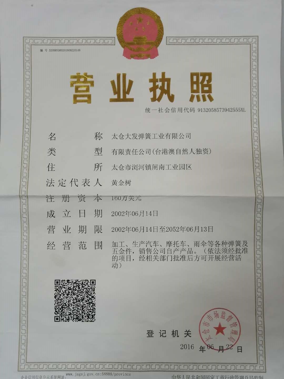 太倉(cāng)大發(fā)彈簧工業(yè)有限公司由黃金樹(shù)先生于1967年始創(chuàng)于臺(tái)灣,是一個(gè)集雨傘、電子、五金機(jī)械、自行車、摩托車、汽車等的彈簧配件生產(chǎn)、加工、輔助設(shè)計(jì)服務(wù)的綜合性企業(yè),其中1990年創(chuàng)辦的廈門大發(fā)彈簧公司、2000年創(chuàng)辦的深圳大發(fā)彈簧公司、2002年創(chuàng)辦的太倉(cāng)大發(fā)彈簧公司均位于經(jīng)濟(jì)發(fā)展地區(qū),地理位置佳。我們憑借在彈簧制造業(yè)的多年豐富知識(shí)與技術(shù),并著眼于以客戶為導(dǎo)向,秉持“以人為本,以質(zhì)為先,以客為主,持續(xù)創(chuàng)新”的經(jīng)營(yíng)理念,強(qiáng)化競(jìng)爭(zhēng)優(yōu)勢(shì)。公司導(dǎo)入ISO9001: 2000質(zhì)量管理體系,執(zhí)行ISO14000:2000管理方式,倡導(dǎo)安全、高質(zhì)量、高素質(zhì)的生產(chǎn)。